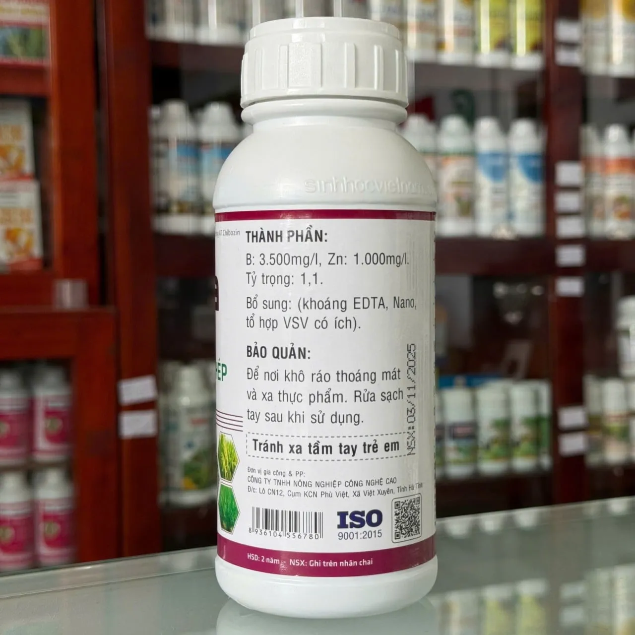 B: 3.500 mg/l, Zn: 1.000 mg/l. Tỷ trọng 1,1.